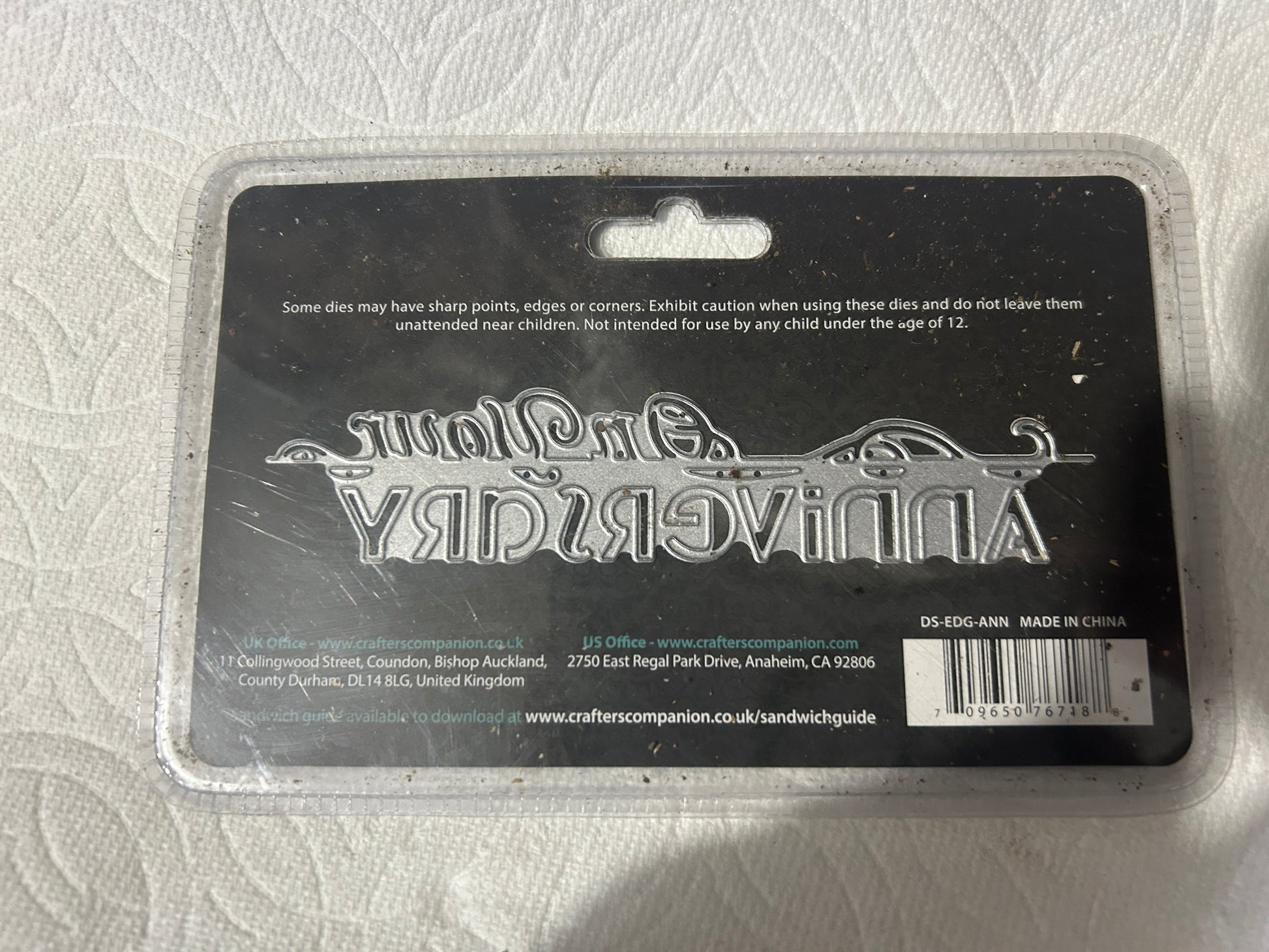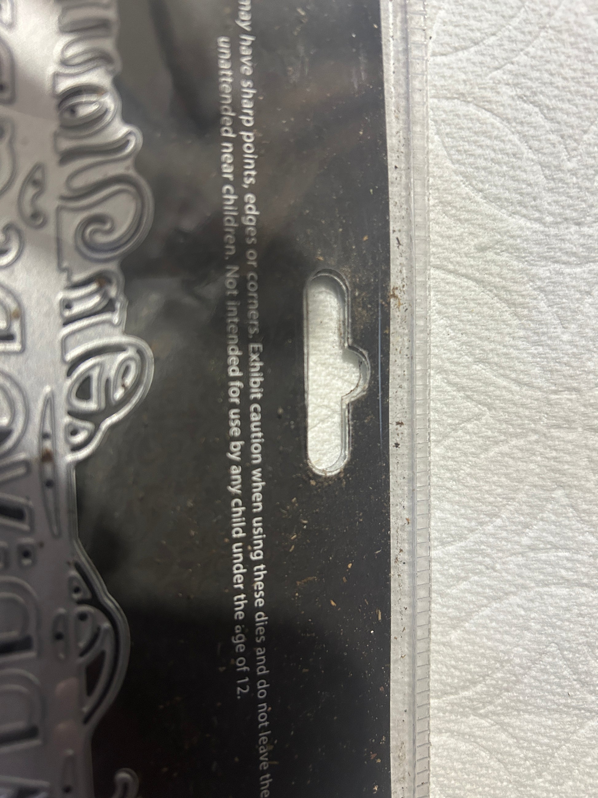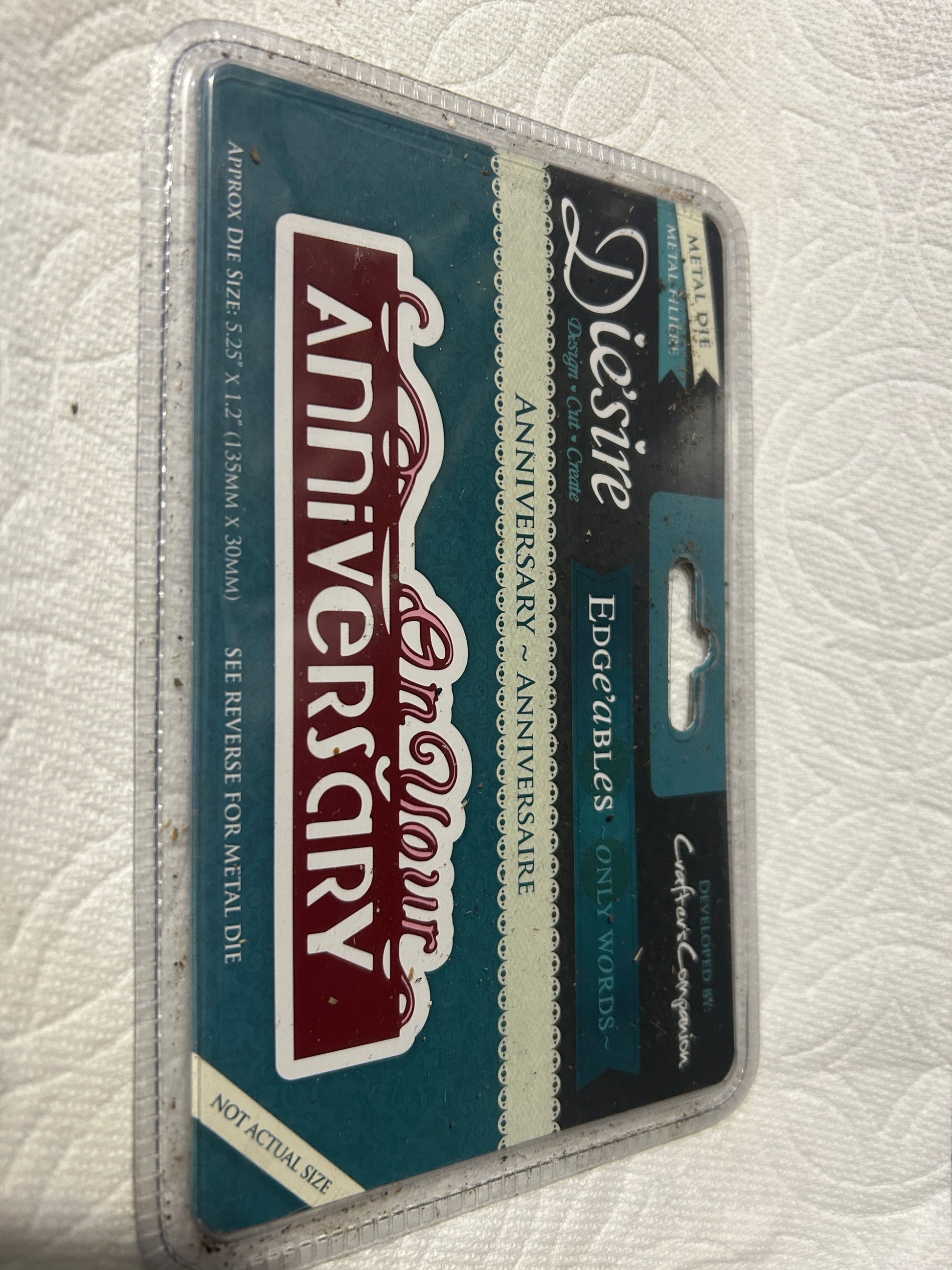 Like new Metal Die from Die'sire created by Crafters Companion. This is part of the Edge'ables only words line. Approximate Die Size 5.25 x 1.25 inches. Note that while this product is new in the package, some dust has managed to enter the package. There are two photos trying to show this.