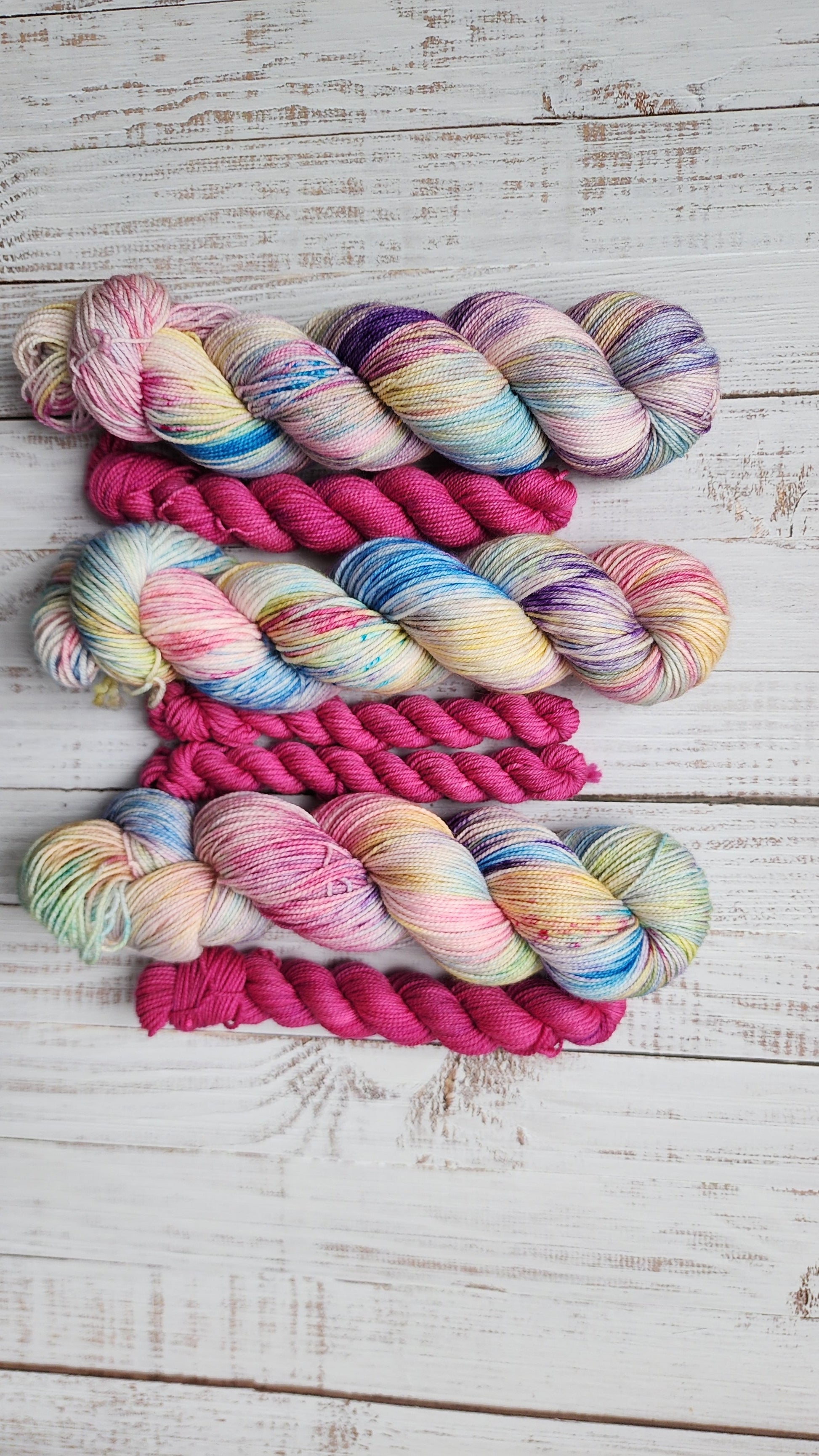 This hand dyed fiber set is perfect for sock knitting! Includes one, 100g skein and one, 20g mini with your choice to add on a matching handcrafted progress keeper