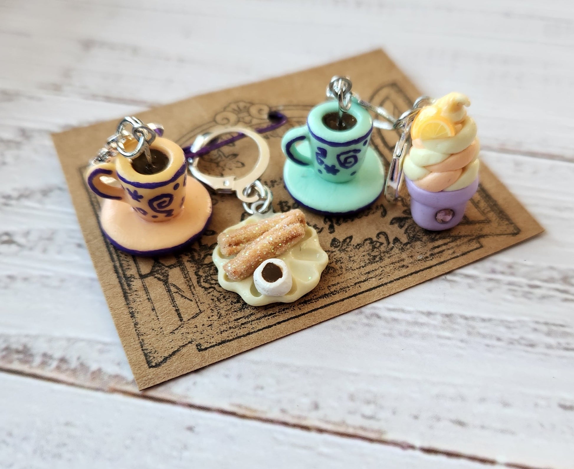 Each trinket is handcrafted using a variety of techniques with needle tools to sculpt these miniatures! Techniques like handpainting, resin art and free hand sculpting. Your trinkets are always made special for you! Lever back hardware allows crochet or knitted use and can be slipped or hooked. Your trinkets should be stored in a hard case or safe space when not in use. Polymer clay is very lightweight and does not pull on your WIP! Decorate your WIPs and enjoy your fiber arts jewelry!